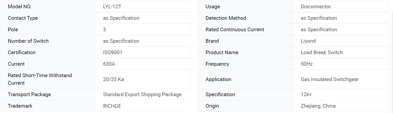 Siri Lyl-12, sesuai untuk tiga fasa AC 50Hz, dengan voltan yang diberi nilai 12kV,
