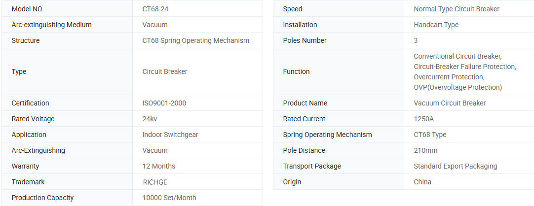Model CT68 -24 Pemutus litar vakum dalaman digunakan dengan mekanisme operasi musim bunga CT68. Ia adalah tiga fasa AC, 50 Hz peralatan ditribusi kuasa dalaman dengan voltan 24kV.