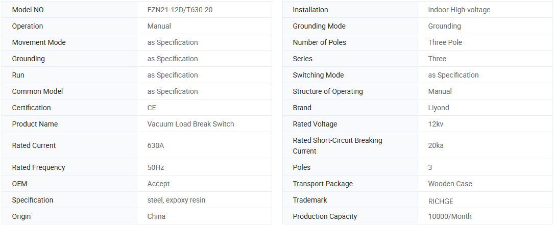 FZN21-12D/T630-20, FZN21-12DR/T125-31.5 Jenis voltan tinggi voltan vakum break dan suis fius beroperasi dalam tiga fasa AC elektrik 12kV, 50Hz sistem pengagihan kuasa, dengan operasi dan penyelenggaraan dan penyelenggaraan yang mudah dan mudah