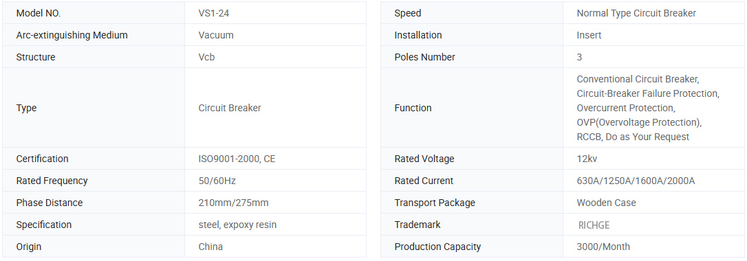 VS1-24 Siri pemutus litar vakum voltan tinggi dalaman dengan silinder terlindung biasa adalah tiga frasa A.C. 50 Hz peralatan pengedaran kuasa dalaman dengan voltan yang diberi nilai 24kV. Ia digunakan untuk melindungi mengawal peralatan elektrik dalam bidang industri dan perusahaan perlombongan, loji kuasa dan pencawang. Jenis pemutus litar vakum ini mematuhi piawaian kebangsaan dan penetapan piawaian IEC, keupayaan mencapai gred M2-E2-C2.